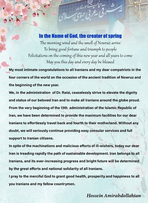 Nowruz congratulatory message of Foreign Minister to Iranian compatriots abroad... "#Iran belongs to all Iranians, and its ever-increasing progress and bright future will be determined by the great efforts and national solidarity of all Iranians."