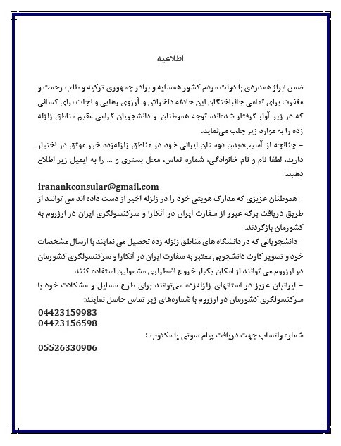 هموطنان عزیزی که مدارک هویتی خود را در زلزله اخیر از دست داده اند میتوانند از طریق دریافت برگه عبور از سفارت ایران در آنکارا و سرکنسولگری ایران در ارزروم به کشورمان بازگردند. - دانشجویانی که در دانشگاههای مناطق زلزله زده تحصیل می نمایند با ارسال مشخصات خود و تصویر کارت دانشجویی معتبر به سفارت ایران در آنکارا و سرکنسولگری کشورمان در ارزروم میتوانند از امکان یکبار خروج اضطراری مشمولین استفاده کنند. - ایرانیان عزیز در استانهای زلزلهزده میتوانند برای طرح مسایل و مشکلات خود با سرکنسولگری کشورمان در ارزروم با شمارههای زیر تماس حاصل نمایند: