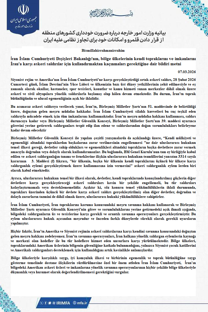 İran İ.C. Dışişleri Bakanlığının bölge ülkelerinin kendi topraklarını İrana karşı saldırılar için kullandırmaktan kaçınmaları gerektiği Hk. bildiri