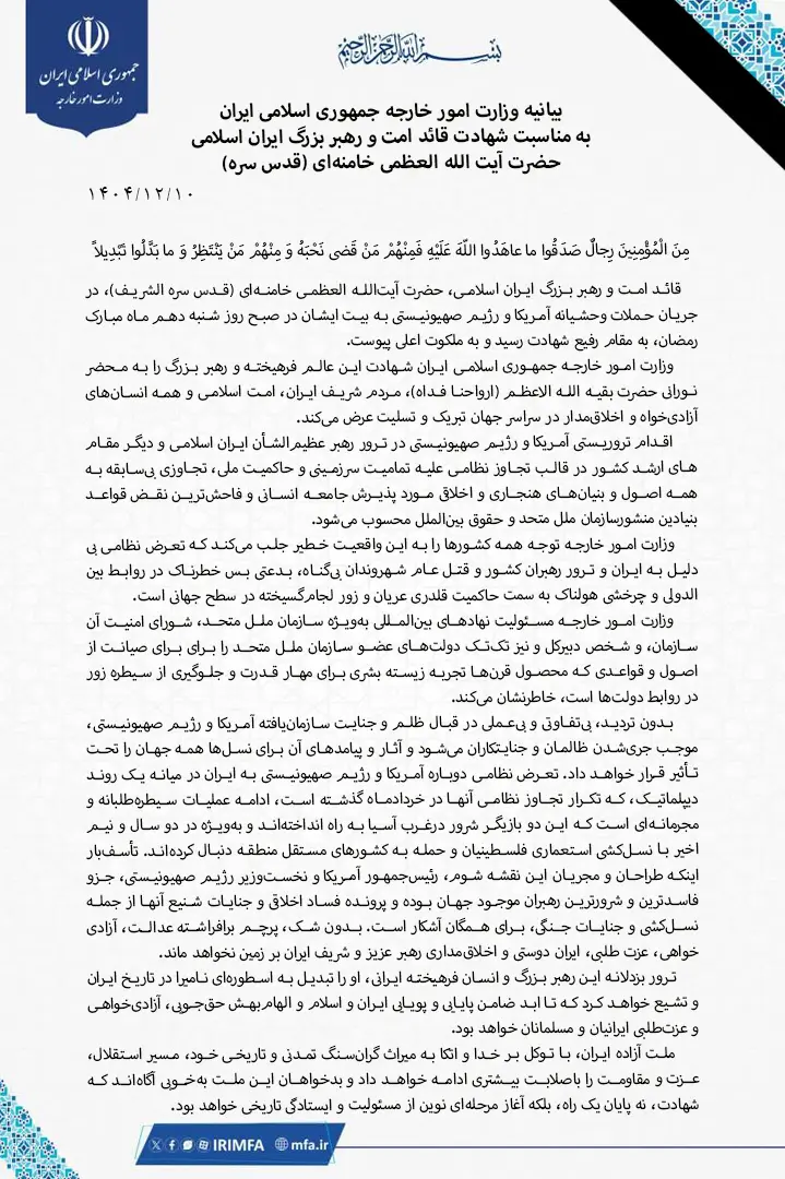İran İslam Cumhuriyeti Dışişleri Bakanlığı’nın İslami İranın büyük lideri Hazreti Ayetullah Hamanei’nin şehadeti münasebetiyle yayımladığı bildiri
